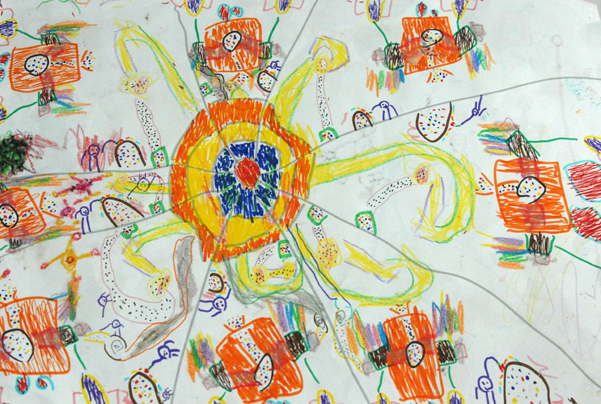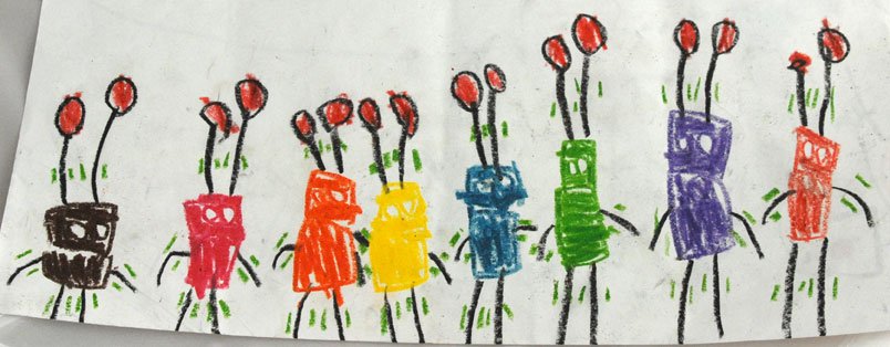 A sua actividade favorita no momento é desenhar. É capaz de continuar o mesmo desenho dias a fio e faz umas coisas extraordinariamente detalhadas, super coloridas e já com um cuidado a nàvel de composição da página que me surpreende. Estou a guardar alguns dos seus desenhos mais detalhados porque o “artista” tem a mania de amarrotar e rasgar os desenhos que faz se por acaso há um risco que não fica como ele queria. Isto em desenhos que demoraram dias a chegar à quele ponto.