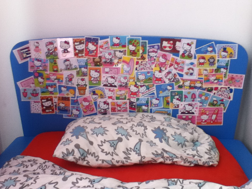 No fim de semana passado, e depois de uma semana com a Joana a acordar à s 3 da manhã a gritar “MàƒàƒàƒàƒàƒàƒàƒàƒàƒEEEEEEEEE!”, resolvemos substituir também a cama dela, ou seja tirá-la da cama de grades. Herdou a antiga cama do Tiago, que decorou com cromos da Hello Kitty, e continua a acordar a meio da noite mas pelo menos já não grita. Agora levanta-se e vai-se sentar à porta do nosso quarto. Não sei porque é que não entra para ir ter connosco. É tão silenciosa que eu geralmente nem acordo.