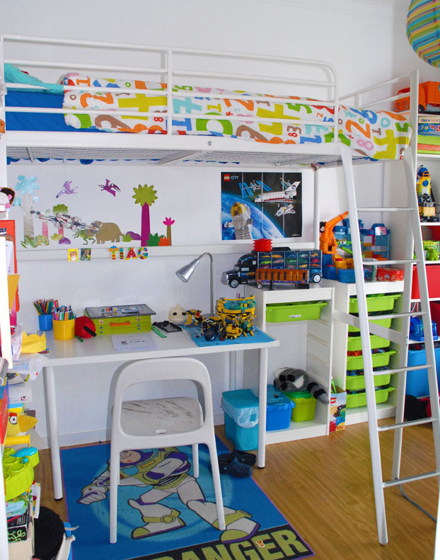 Para o Tiago comprámos uma cama alta e uma secretária para por por baixo. A ideia era ver se ele passava a desenhar no quarto porque a sala estava sempre um caos. Até agora tem funcionado bem. A cama foi um sucesso e assim que conseguimos convencer a Joana que não podia subir, não tem sido um grande problema.