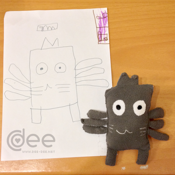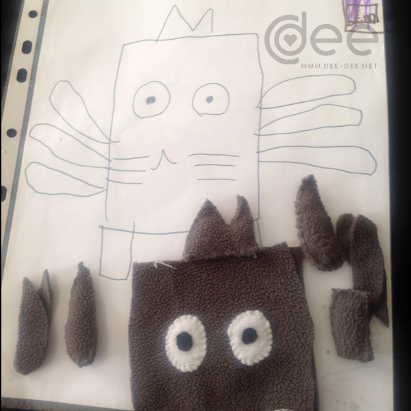Os gatos do Tiago são quadrados, o que me lembrou a minha colecção de bonecos Stuffed Squares. Resolvi fazer um gato de peluche baseado num dos seus desenhos. Ele fez o desenho em grande do gato Fermio porque um dos seus interesses recentes é a tabela periódica. Ele gostou tanto do gato que já prometeu um a um amigo e ofereceu outro à minha amiga Carla quando nos veio visitar na segunda feira. Acho que vou estar ocupada por uns tempos, a fazer gatos.