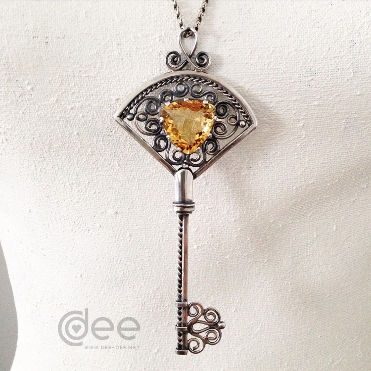 This was the piece where I finally began joining silversmith techniques with the elements and themes I most identify with. All jewellery pieces are designed from a personal perspective – whether we prefer pointy or round shapes, large or small, etc – but here I began to solidify what i feel is my style of jewellery: a combination between sheet metal and wire, with a gorgeous stone as the focal point, oxidized silver and lots of details and texture. The idea of the key comes from my appreciation of steampunk imagery.