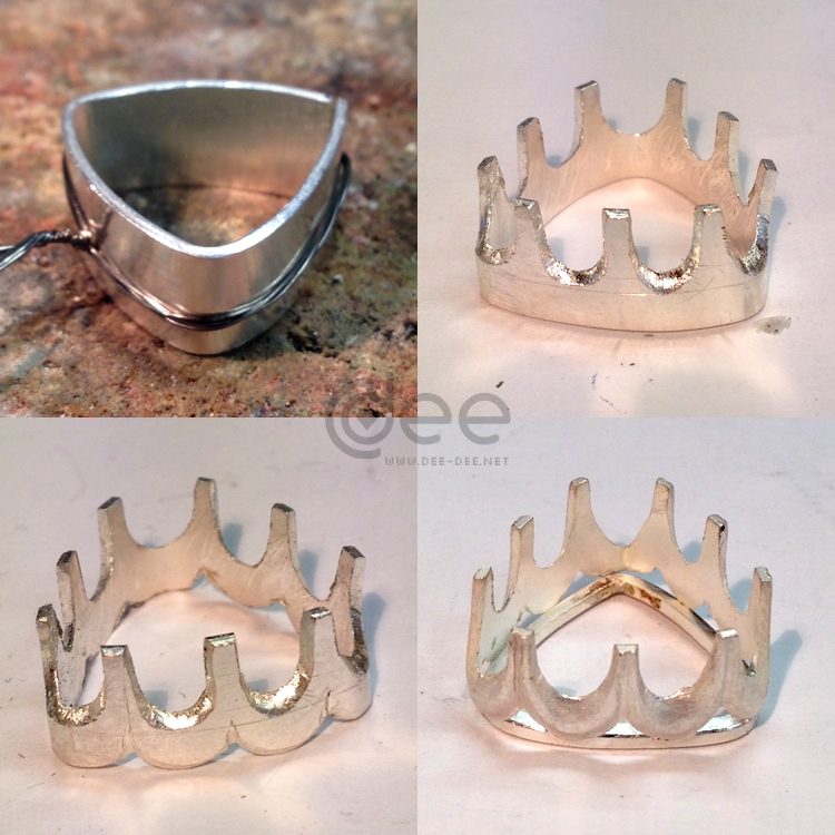 Fazem-se cortes espaçados à volta da chapa, primeiro com a serra e depois com a lima triangular. Esses cortes são depois alargados e arredondados com uma fresa ou lima de meia cana, formando assim as garras e a forma de coroa. No enfiamento vertical das garras são também cortadas pequenas fendas em baixo que são igualmente arredondadas para dar a ideia de pequenos Us entre cada duas garras. Vai-se limando a chapa até a forma estar aperfeiçoada. Por fim limam-se linhas verticais no centro de cada garra para parecer que estas são mais finas e o resultado ser mais delicado.