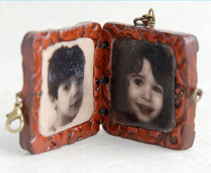 I textured and aged it with acrylic paint and applied a gloss varnish. The pictures were transfered onto light flesh-tone clay. I used a natural stone cabochon on the cover, thread to bind both pictures and a lobster clasp to close it and also on top to attach it to a necklace, key-chain or anything else I want.