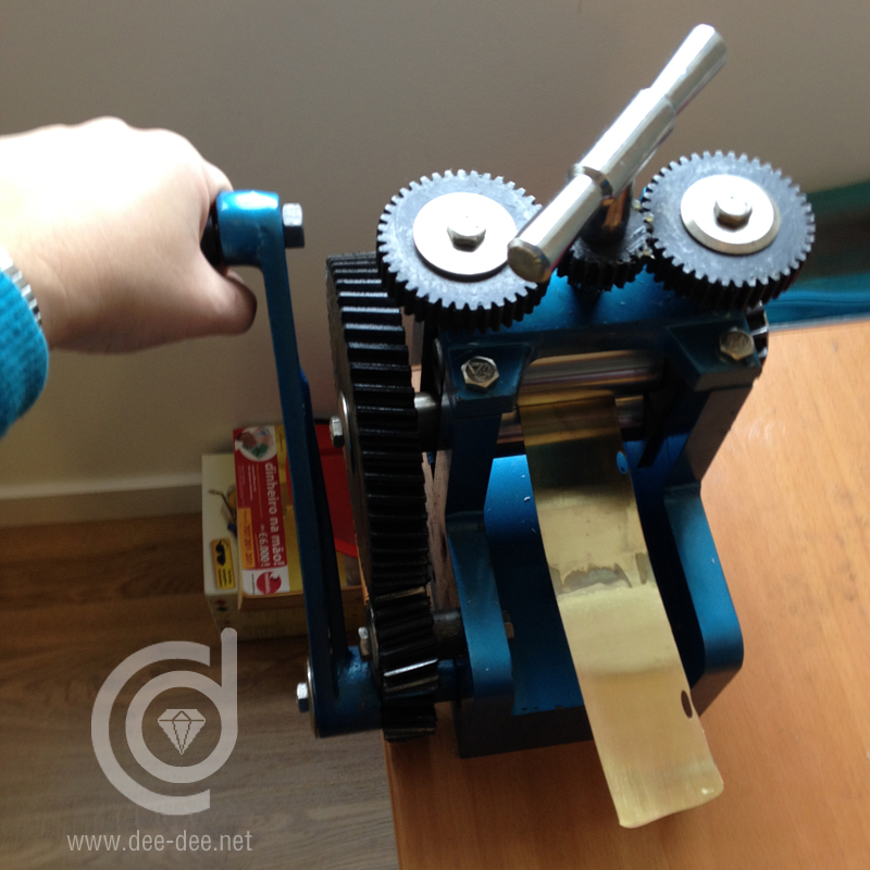 O lingote foi depois transformado em fio quadrado no laminador. Vai passando pelos rolos em sulcos cada vez mais finos até ficar do tamanho pretendido. Neste caso, como a quantidade de ouro era limitada, concentrei-me mais no comprimento que o fio precisava de ter para conseguir fazer duas alianças. Parei quando obtive um fio com 9 cm de comprimento.