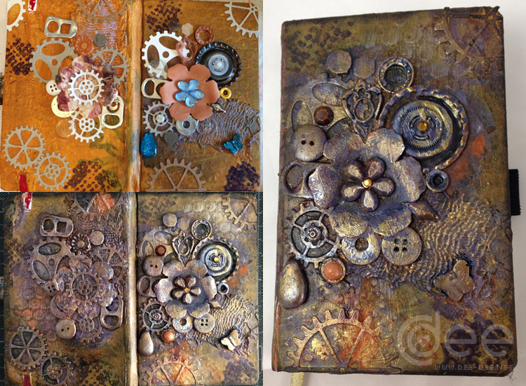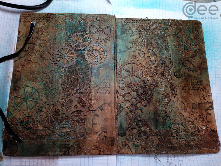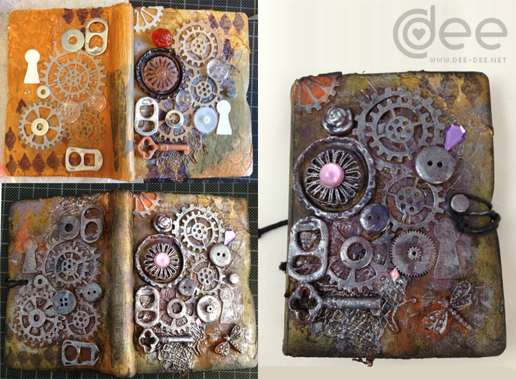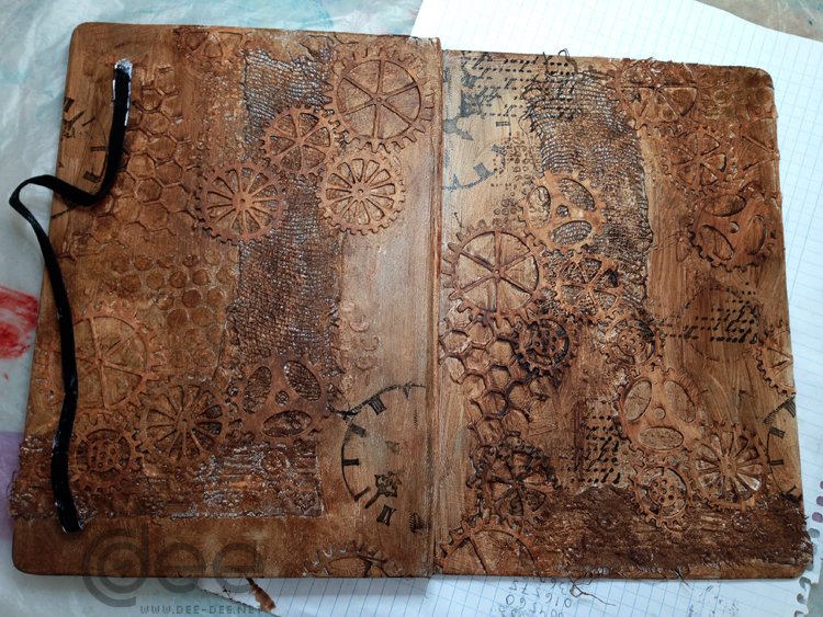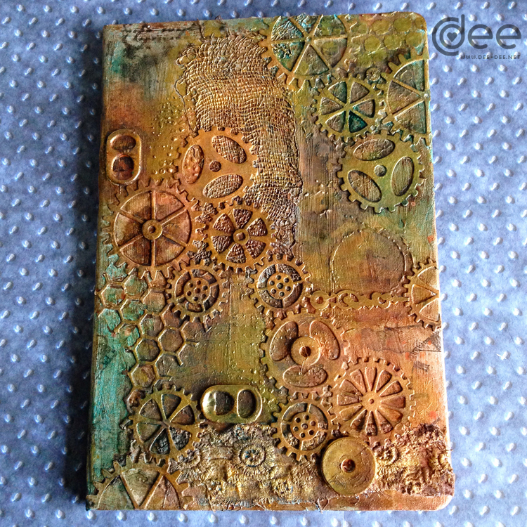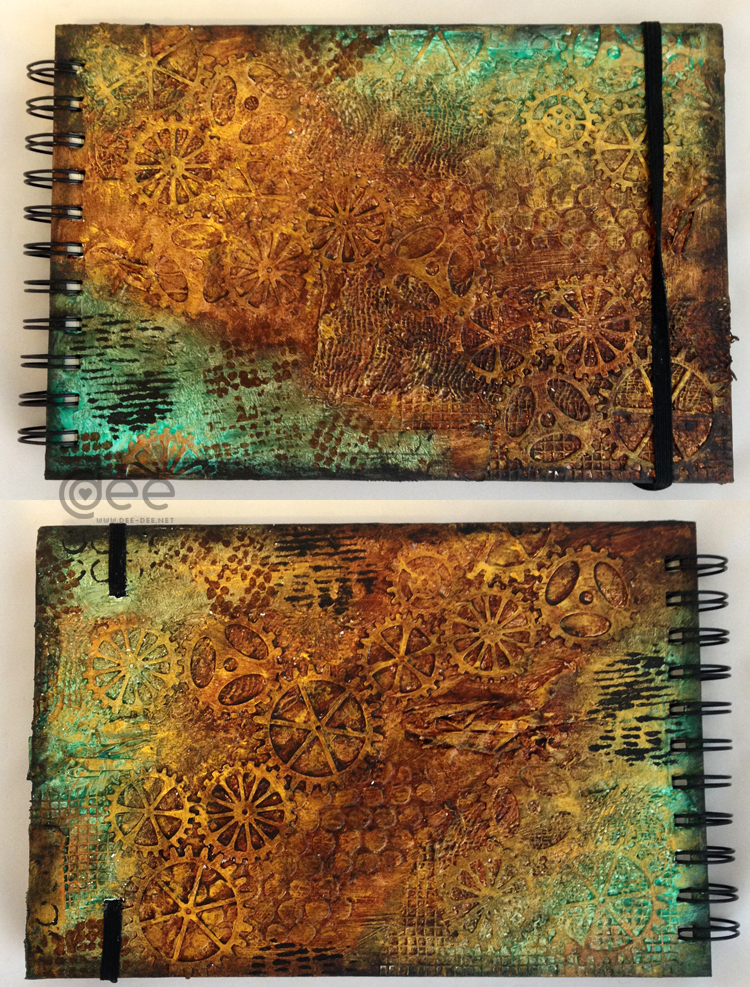 Since I’ve been in a steampunk mood lately, I finally bought some gear dies for my Sizzix and a bunch of stencils, so it was time to try out some mixed media projects.