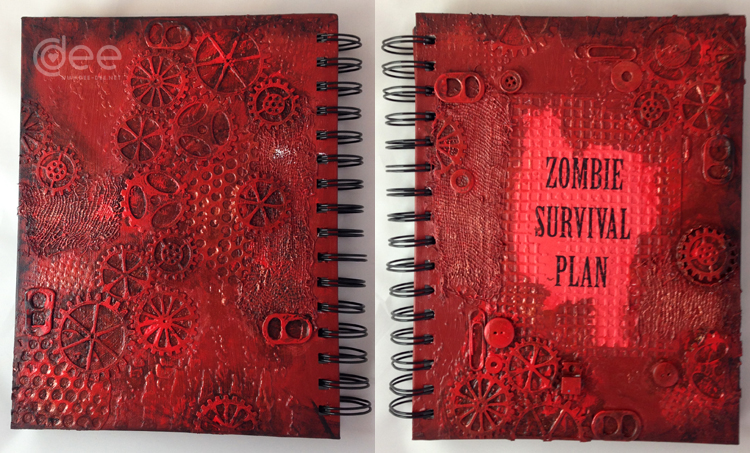 This is my favourite. I had already done the title, so I just built the rest around it, with the zombie theme in mind. I used dark red for the background and bright red for the highlights, which really pop. I sponged some black around the edges to add depth.