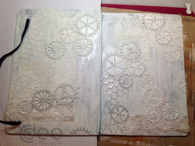 I cut some gears with my Sizzix and added them to the layout before covering with more gesso. When you work with cardstock or cardboard you can use white glue to assemble the layout. If you plan to include metal, plastic, resin or polymer clay elements you should use a glue that works with these materials or gel medium.