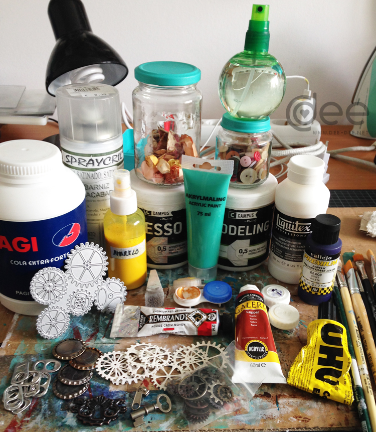 Colei as minhas rodas dentadas, cortadas na Sizzix, e cobri tudo com mais uma camada de gesso. Quando trabalhamos só com papel ou cartão podemos usar cola branca. Quando se incluem peças metálicas, de plástico, resina, Fimo, etc, é que já convém escolher uma cola que funcione com estes materiais. Geralmente uma coisa tipo UHU làquida serve perfeitamente.